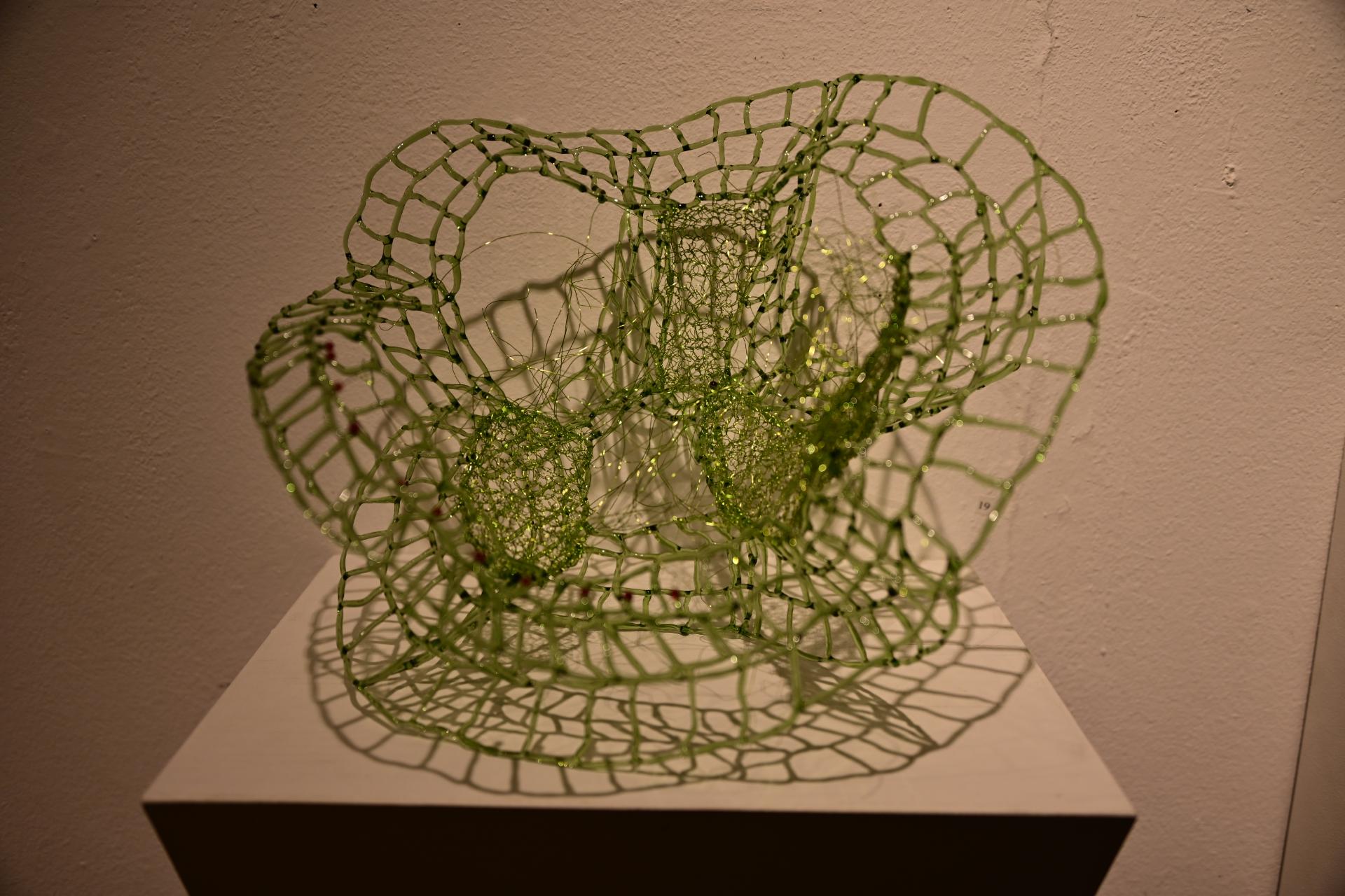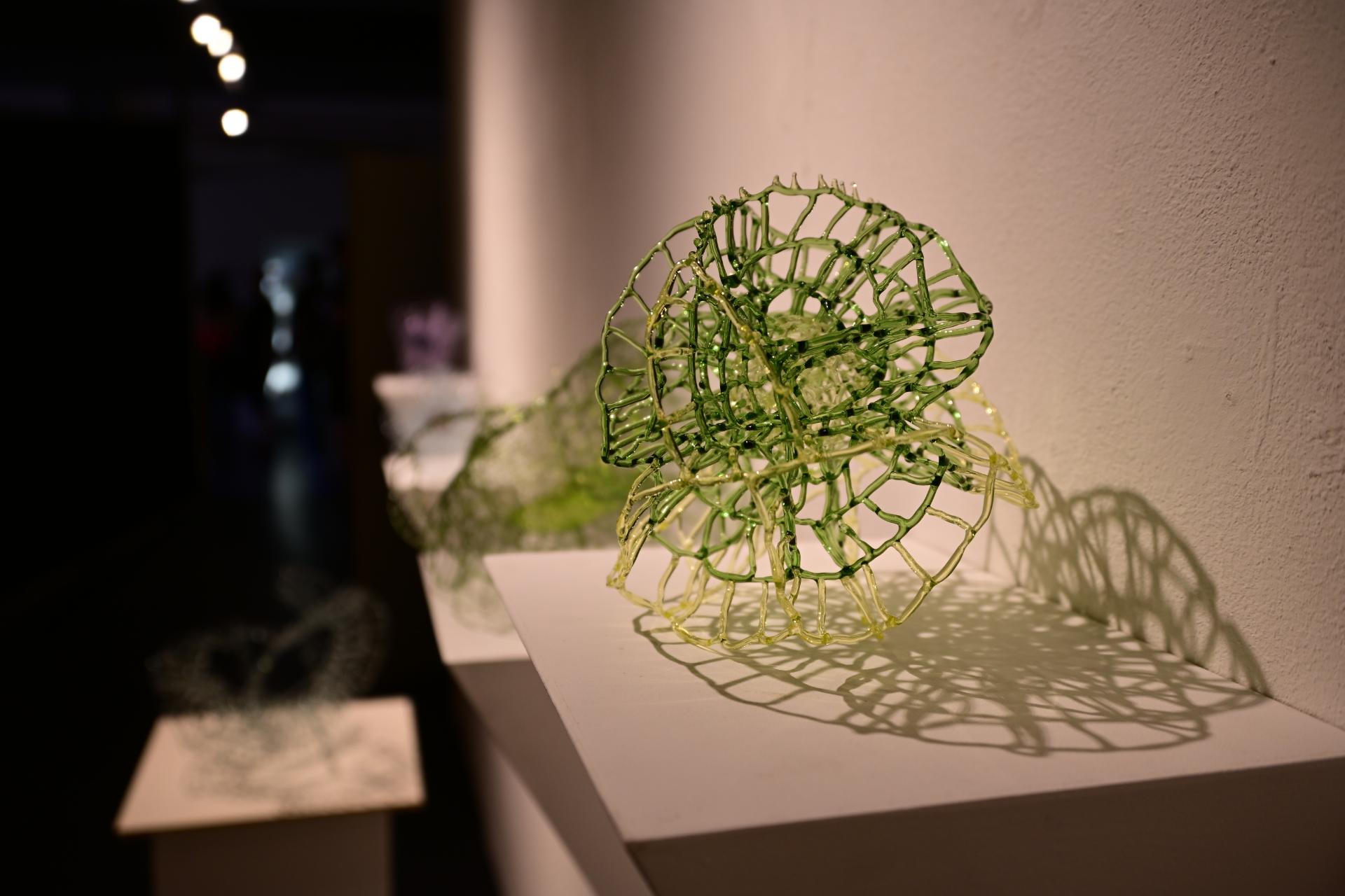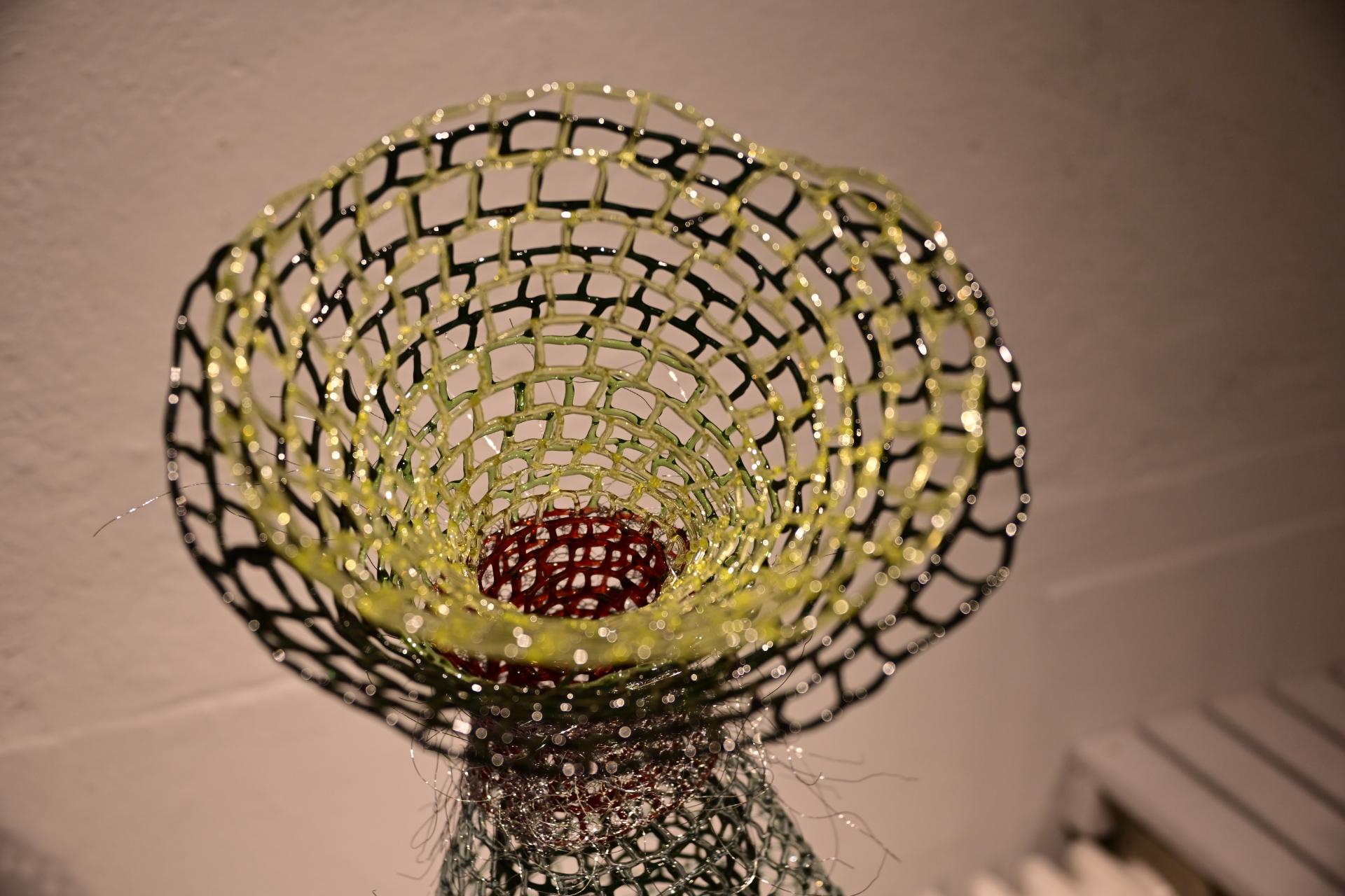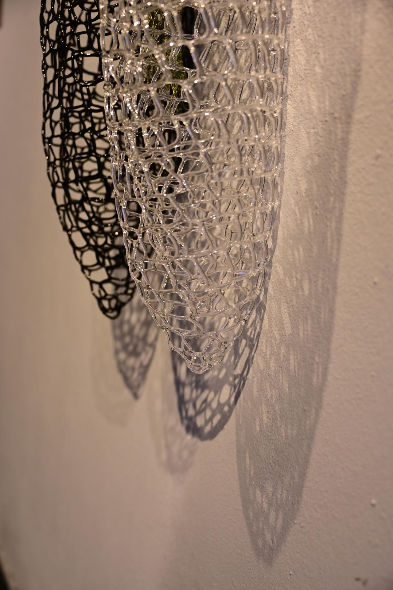 Nadja Recknagel fängt in ihren Glas- und Keramikskulpturen die fragile Schönheit der Natur durch filigrane Netzstrukturen und erdverbundene Formen ein. Recknagels Glasobjekte, die aus heiß geschmolzenen Glasstäben entstehen, erinnern an Pflanzenfasern und Nervengeflechte, während ihre Keramiken organische Strukturen präsentieren, die an fossile Formen erinnern.