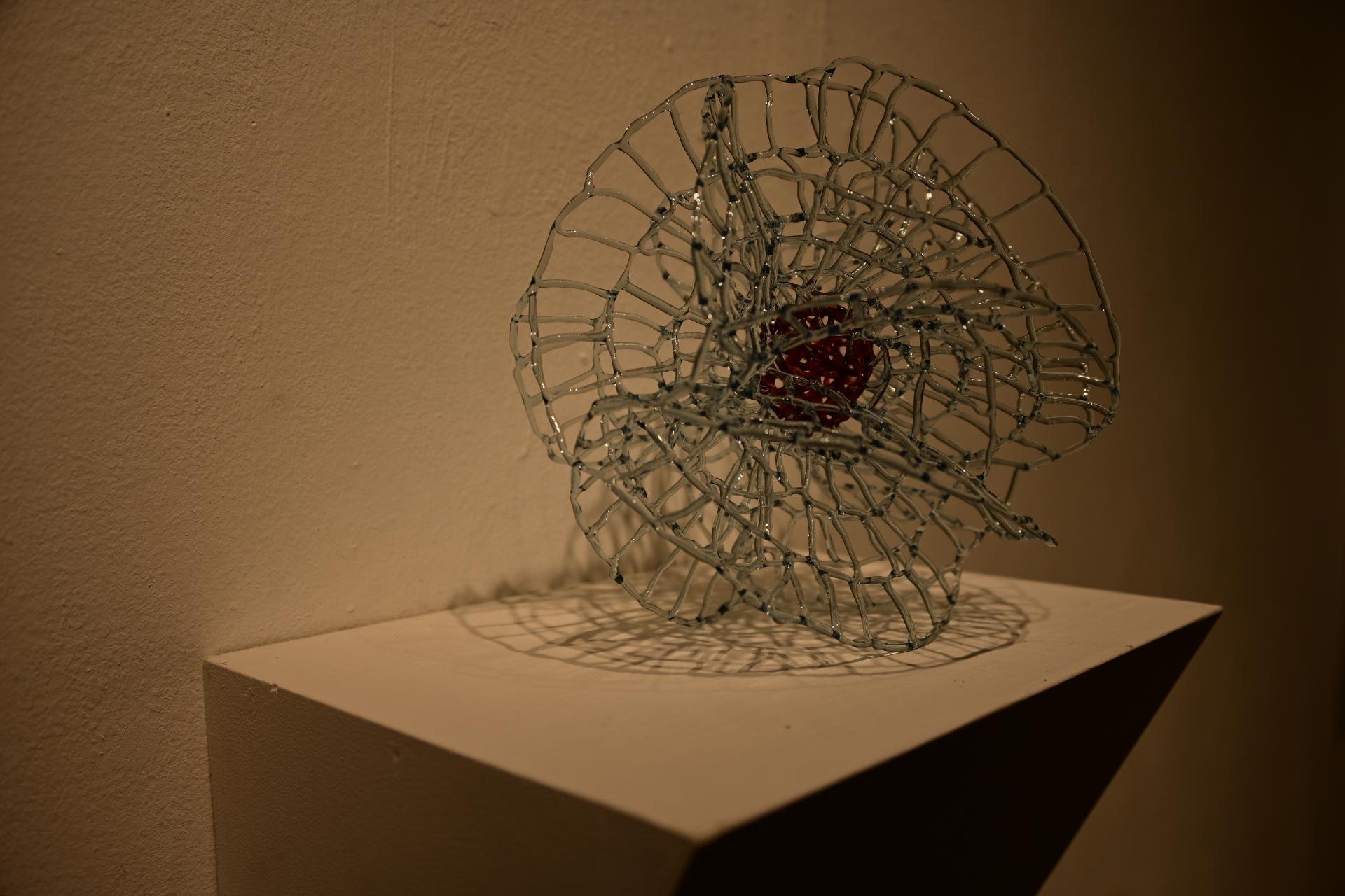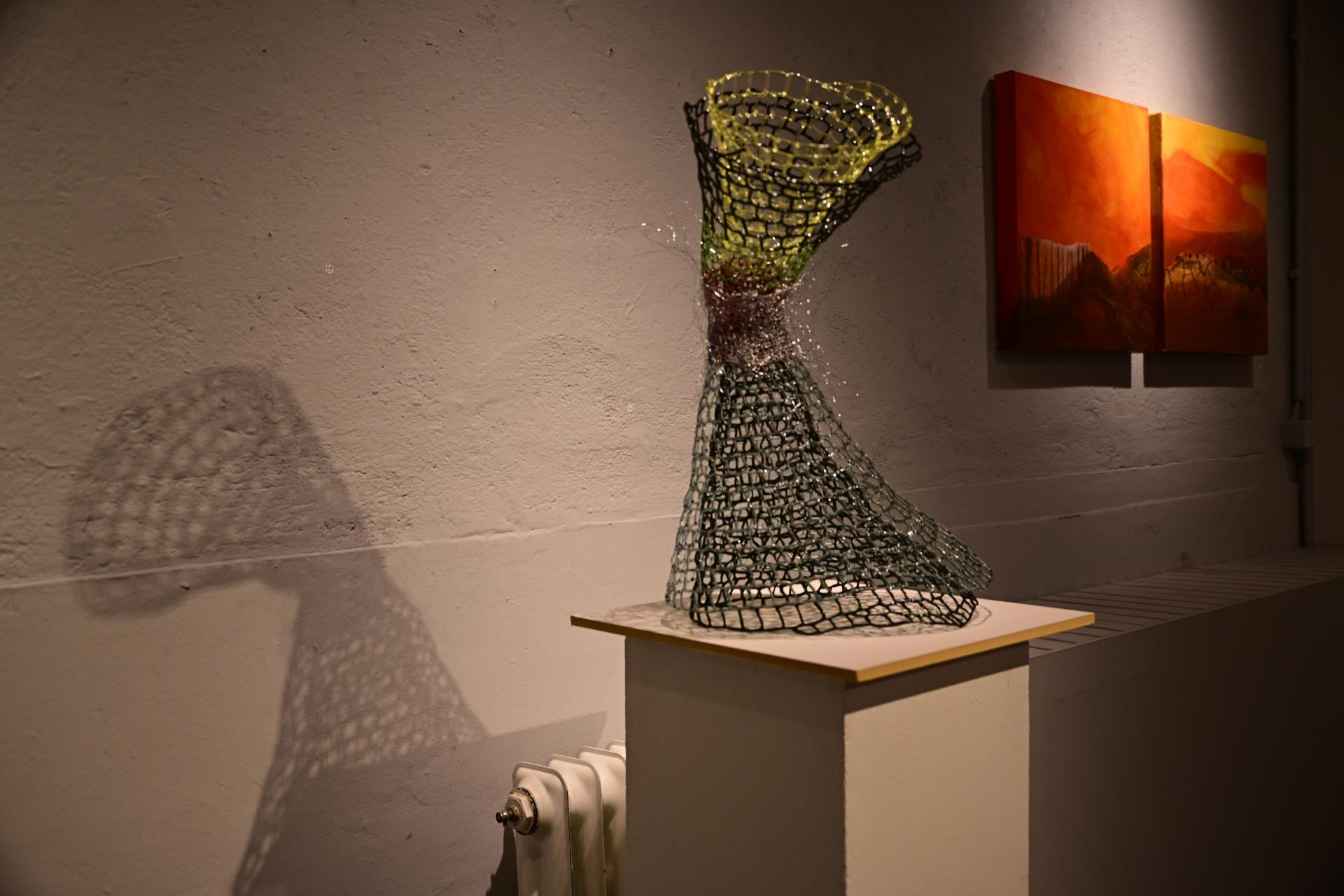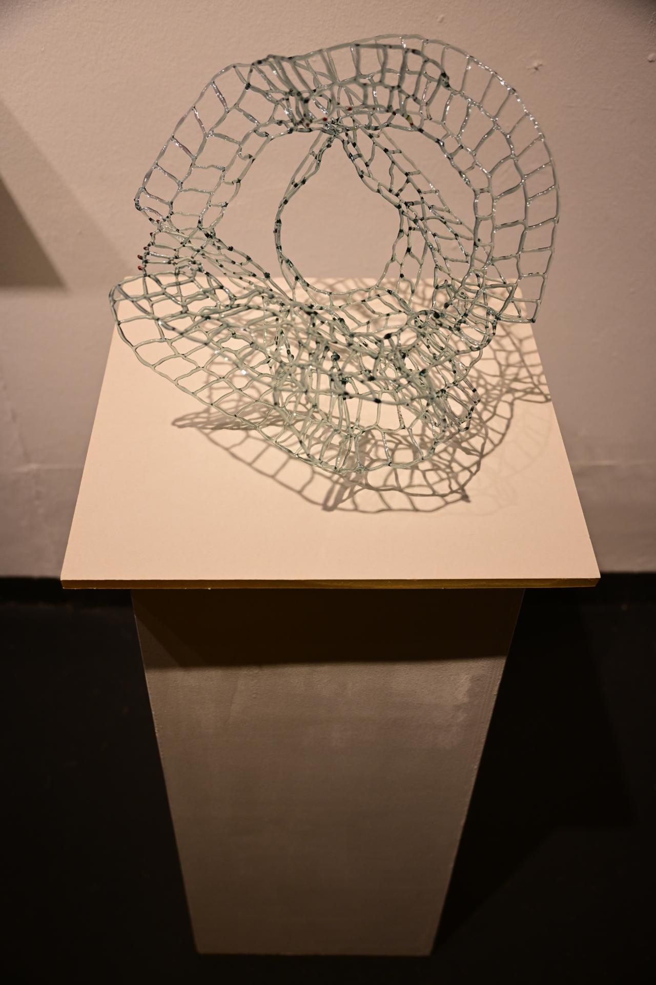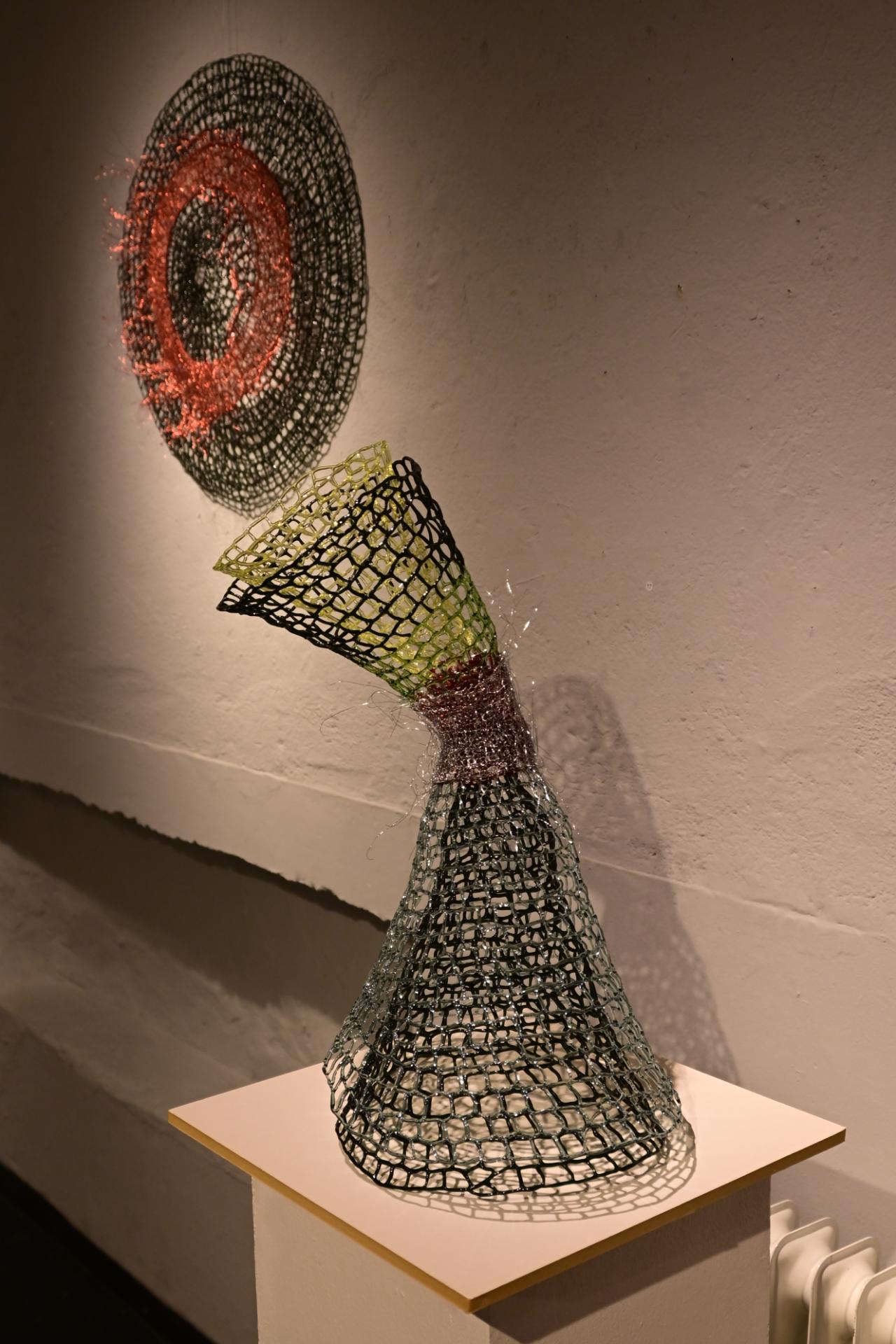 Nadja Recknagel fängt in ihren Glas- und Keramikskulpturen die fragile Schönheit der Natur durch filigrane Netzstrukturen und erdverbundene Formen ein. Recknagels Glasobjekte, die aus heiß geschmolzenen Glasstäben entstehen, erinnern an Pflanzenfasern und Nervengeflechte, während ihre Keramiken organische Strukturen präsentieren, die an fossile Formen erinnern.