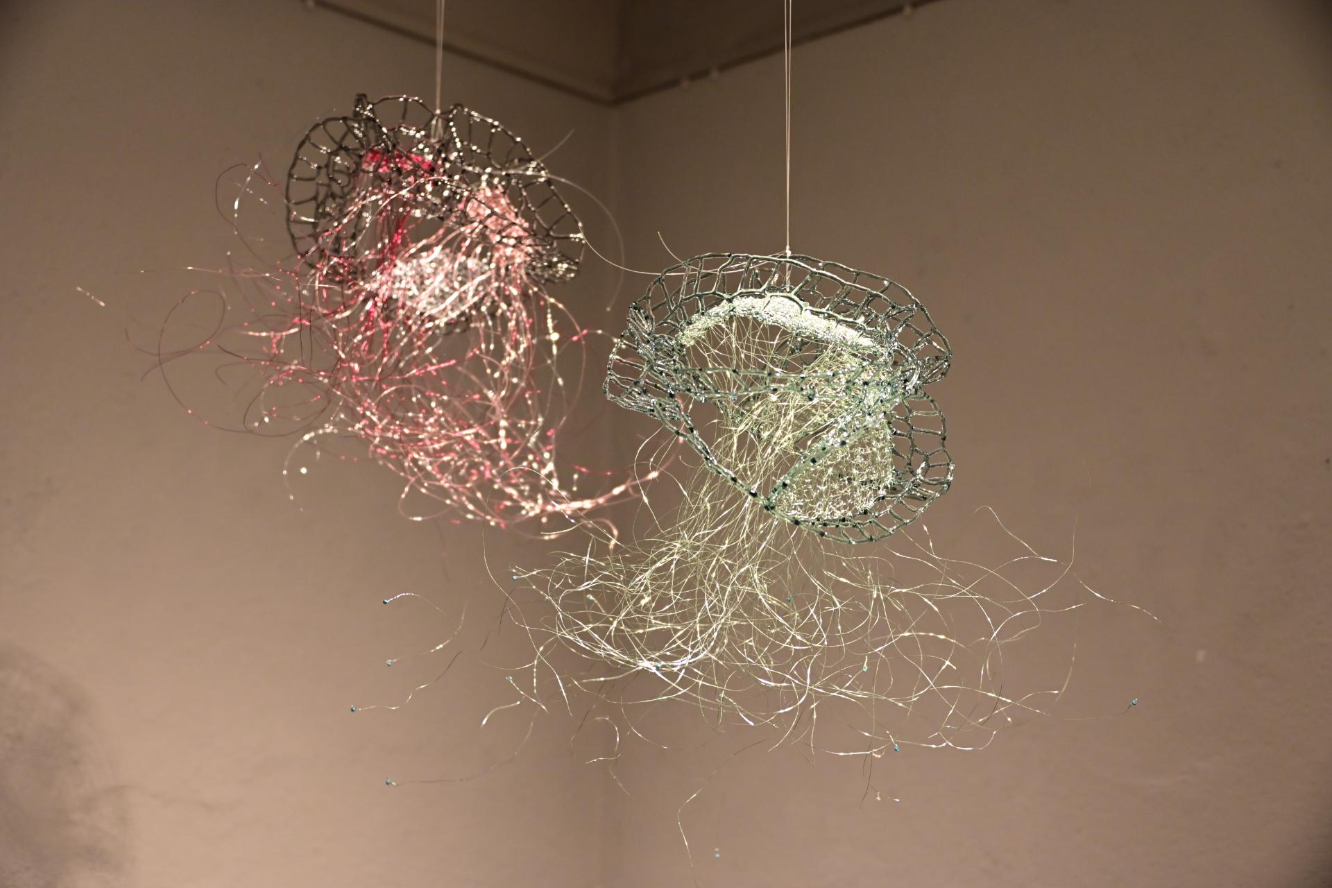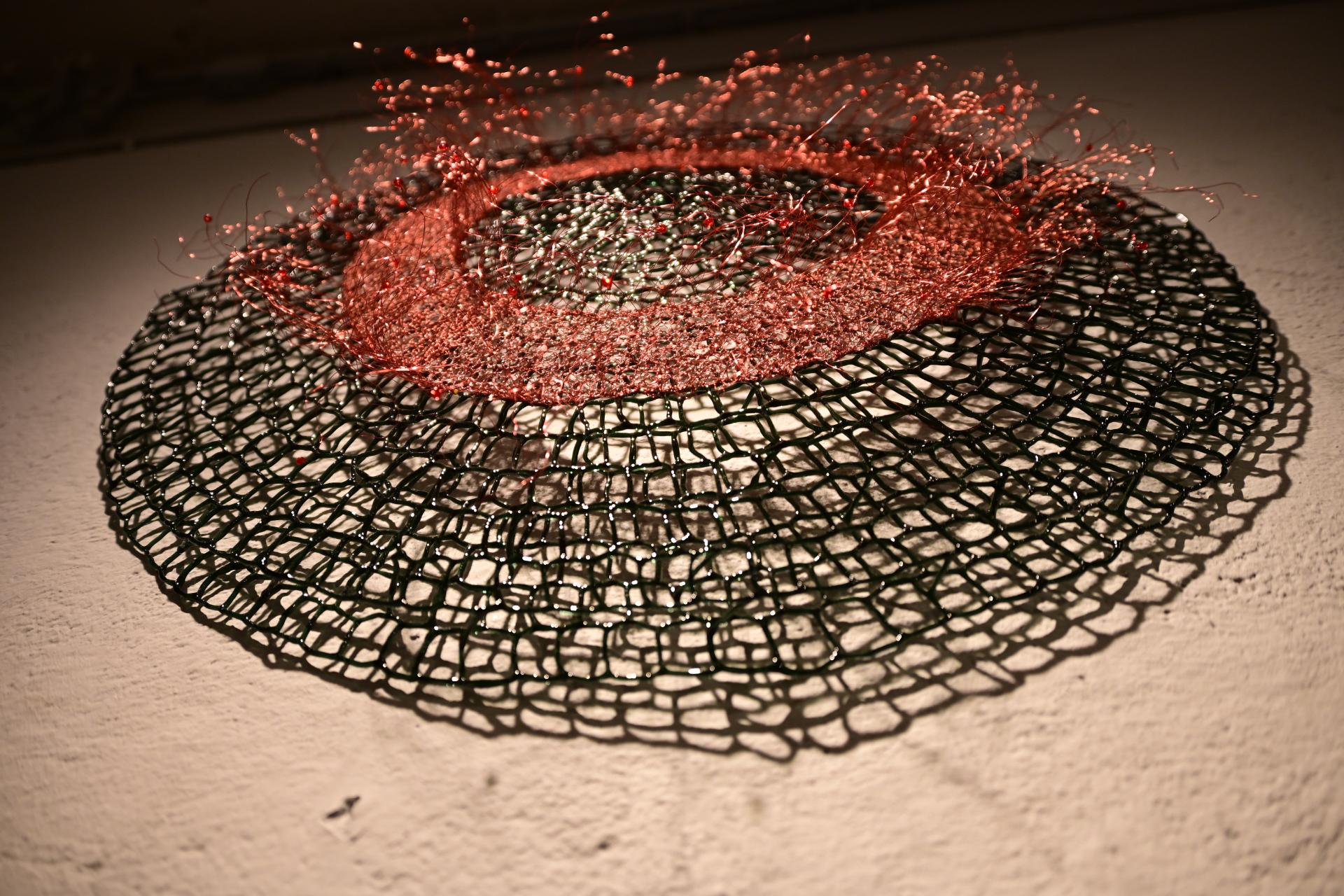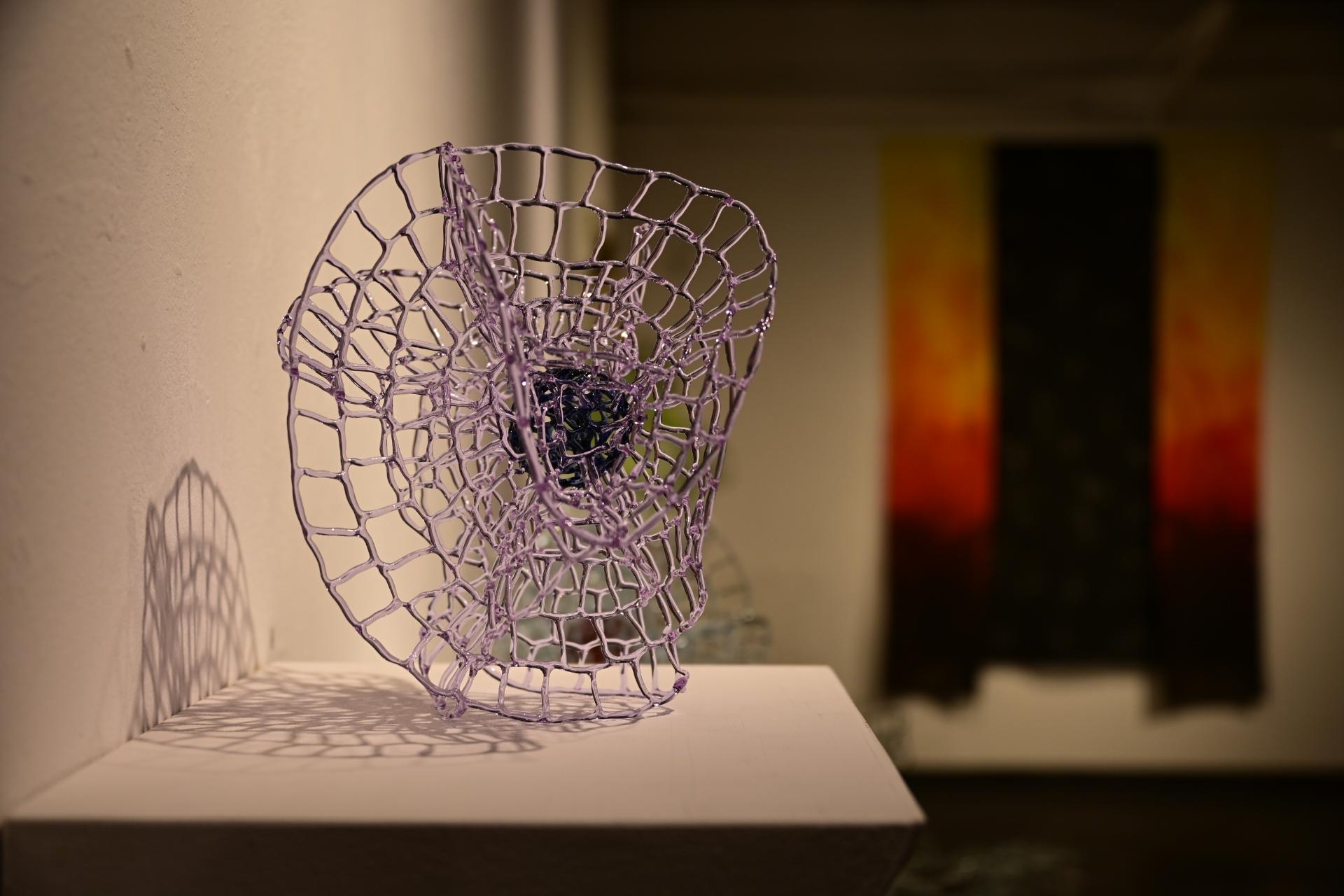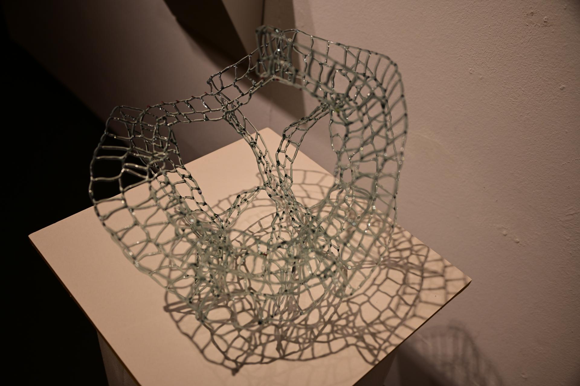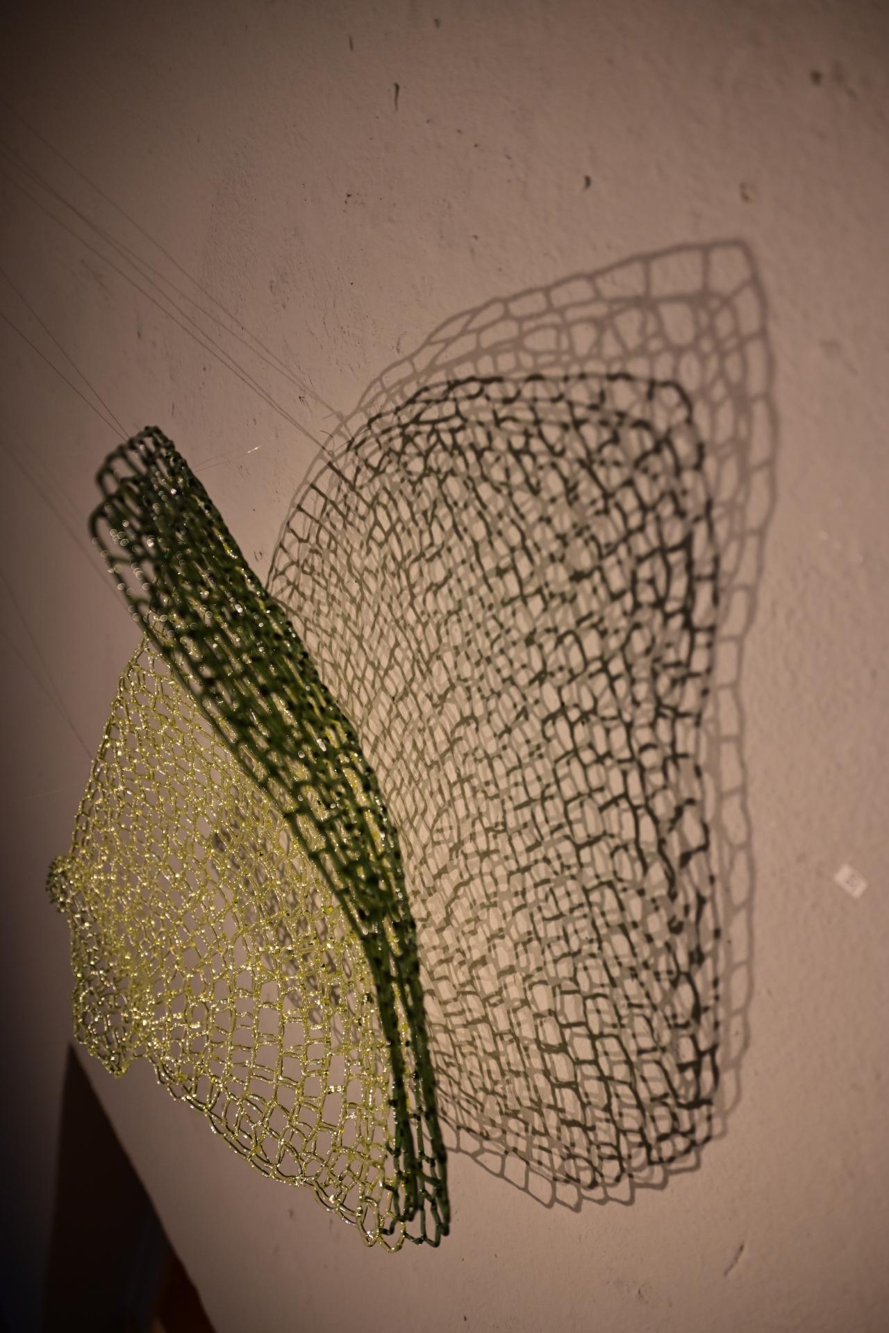 Nadja Recknagel fängt in ihren Glas- und Keramikskulpturen die fragile Schönheit der Natur durch filigrane Netzstrukturen und erdverbundene Formen ein. Recknagels Glasobjekte, die aus heiß geschmolzenen Glasstäben entstehen, erinnern an Pflanzenfasern und Nervengeflechte, während ihre Keramiken organische Strukturen präsentieren, die an fossile Formen erinnern.