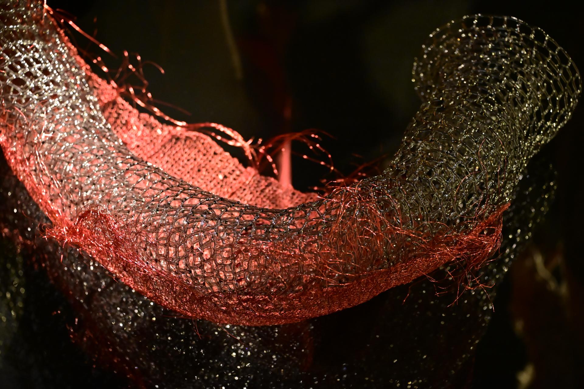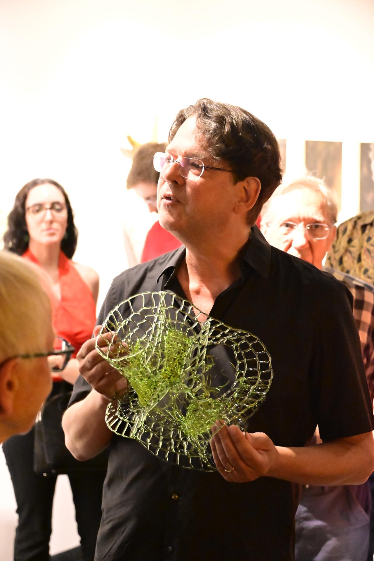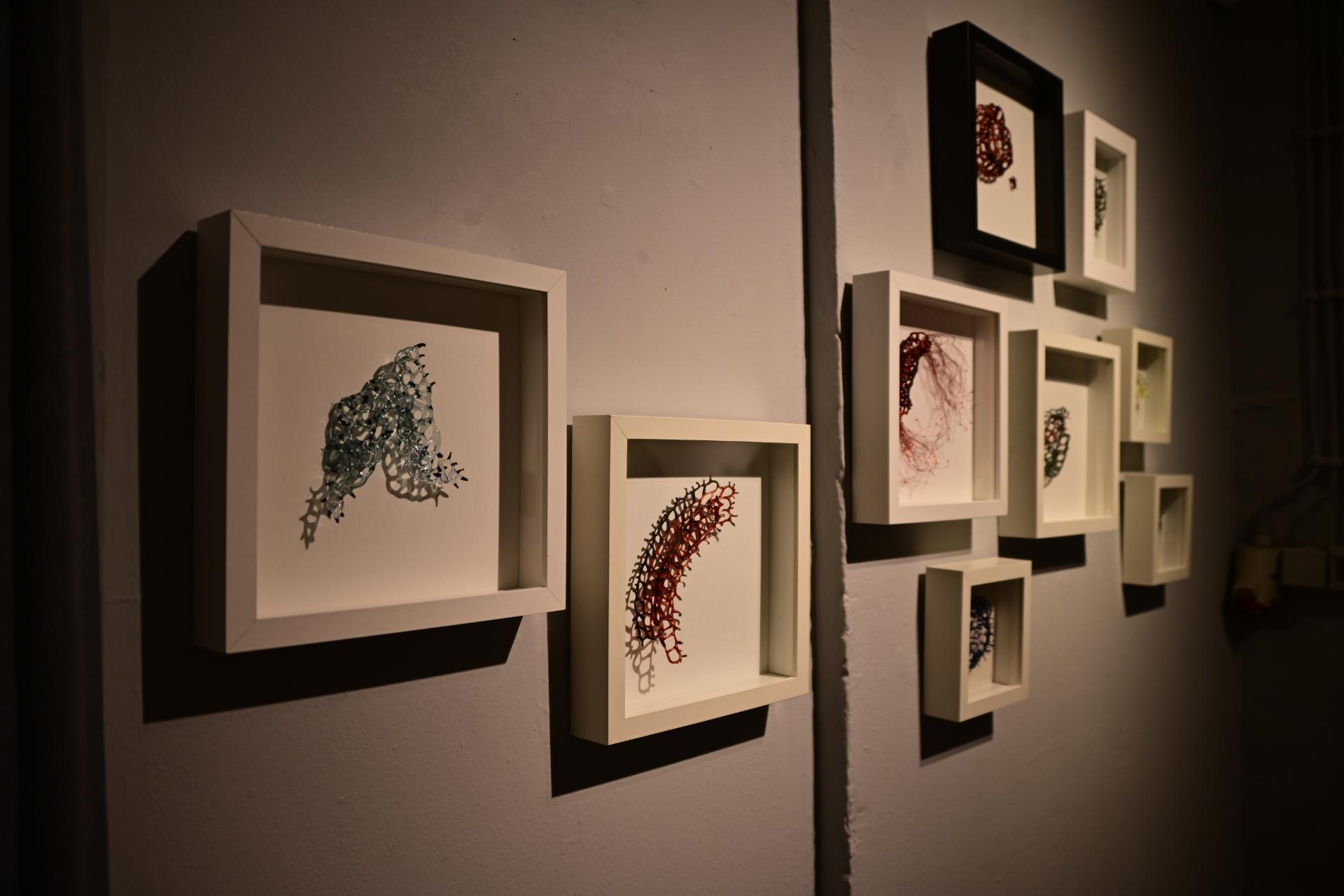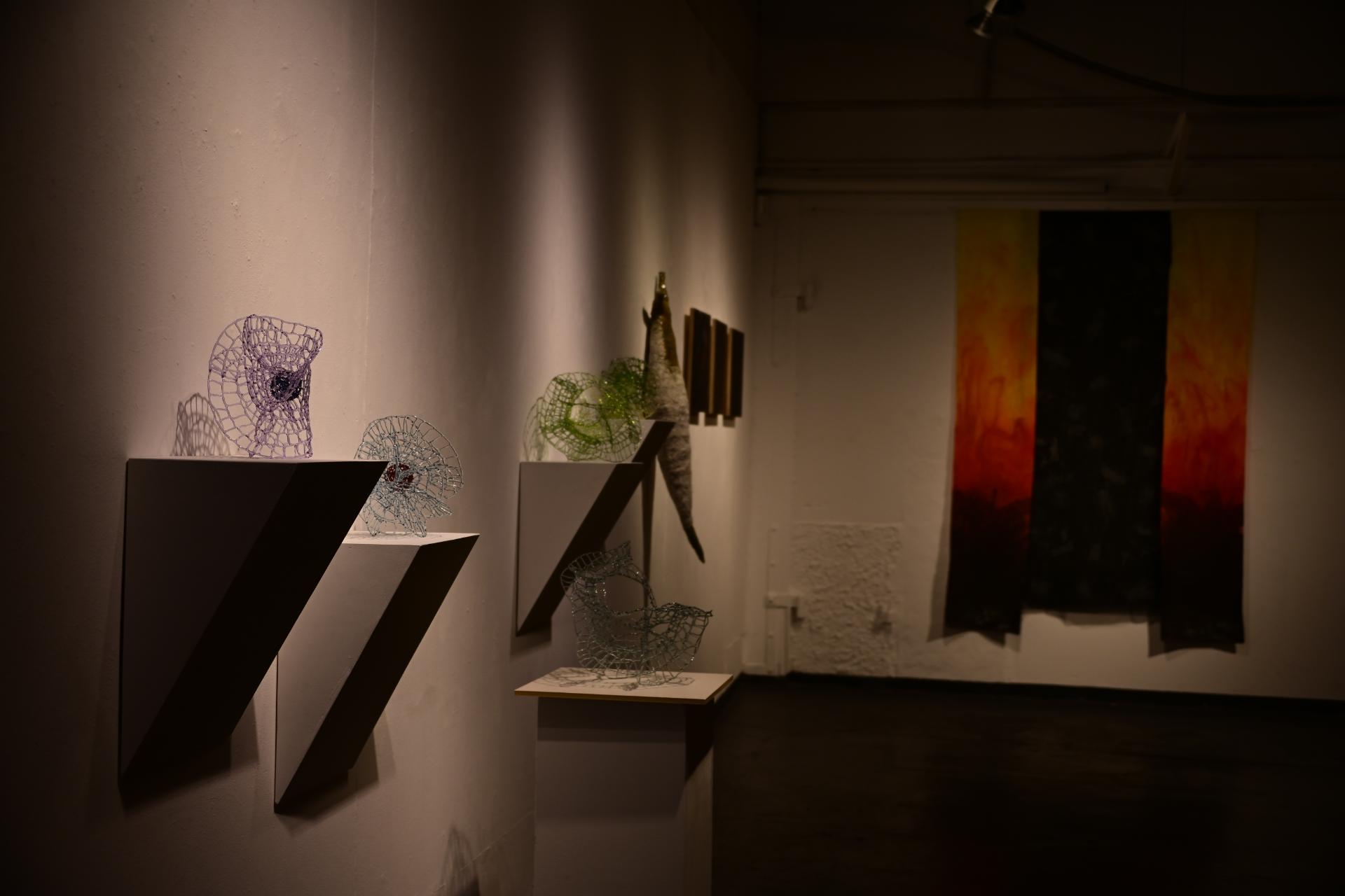 Nadja Recknagel fängt in ihren Glas- und Keramikskulpturen die fragile Schönheit der Natur durch filigrane Netzstrukturen und erdverbundene Formen ein. Recknagels Glasobjekte, die aus heiß geschmolzenen Glasstäben entstehen, erinnern an Pflanzenfasern und Nervengeflechte, während ihre Keramiken organische Strukturen präsentieren, die an fossile Formen erinnern.